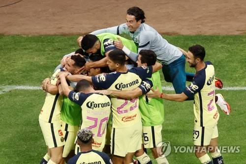 epa09533357 America's players celebrate after scoring against Santos Laguna, during a match for day 14 of the MX League's Apertura Tournament at the Azteca Stadium in Mexico City, Mexico, 19 October 2021. EPA/Jose Mendez