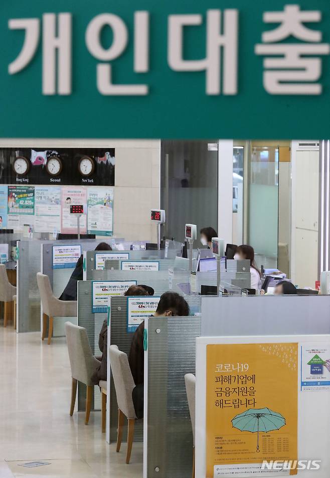 [서울=뉴시스] 백동현 기자 = 하나은행이 가계대출 총량 관리를 위해 일부 대출상품의 신규 신청을 중단한 20일 오전 서울 중구 하나은행 영업부에서 고객들이 상담을 받고 있다. 2021.10.20. livertrent@newsis.com