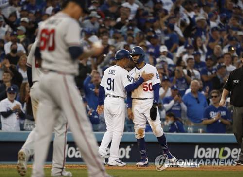 epa09533358 Los Angeles Dodgers Mookie Betts (R) chats with Los Angeles Dodgers third base coach Dino Ebel (C) after advancing to third base on Los Angeles Dodgers Trea Turner's single against the Atlanta Braves during the eighth inning of game 3 of the National League Championship Series MLB playoff baseball game between the Atlanta Braves and the Los Angeles Dodgers at Dodgers Stadium in Los Angeles, California, USA, 19 October 2021. EPA/CAROLINE BREHMAN