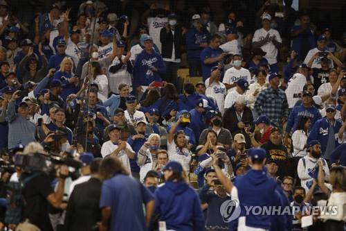 epa09533359 Los Angeles Dodgers fans cheer on their team after defeating the Atlanta Braves in game 3 of the National League Championship Series MLB playoff baseball game between the Atlanta Braves and the Los Angeles Dodgers at Dodgers Stadium in Los Angeles, California, USA, 19 October 2021. EPA/CAROLINE BREHMAN