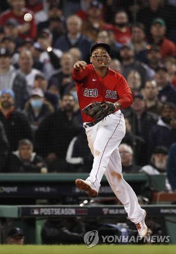epa09533360 Boston Red Sox third baseman Rafael Devers throws to first base in time to get Houston Astros batter Jose Altuve to end the top of the fifth inning of game four of the MLB American League Championship Series between the Boston Red Sox and the Houston Astros at Fenway Park in Boston, Massachusetts, USA, 19 October 2021. EPA/CJ GUNTHER