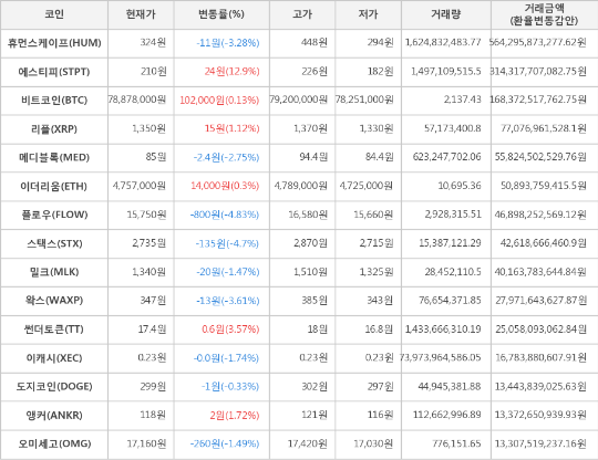 또한, 스택스(-4.7%, 2,735원), 왁스(-3.61%, 347원), 휴먼스케이프(-3.28%, 324원), 메디블록(-2.75%, 85원), 이캐시(-1.74%, 0.23원), 오미세고(-1.49%, 17,160원), 밀크(-1.47%, 1,340원), 도지코인(-0.33%, 299원)이 하락세를 나타냈다.
