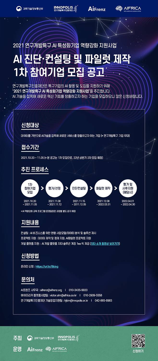 데이터 기반으로 AI 기술을 접목해 새로운 비즈니스를 창출하고자 하는 특구기업 등이 대상이며, 선정기업에는 현행 사업모델에 대한 분석과 개선 솔루션, 데이터 제작·정제, AI 파일럿 제작 지원과 함께 AI 개발 플랫폼 연계 기회까지 지원받을 수 있다.
