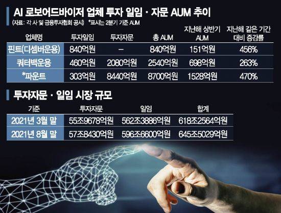 파운트투자자문의 경우 아직 3분기 실적이 집계되지 않았지만 자산 규모 증가세는 지속될 것으로 예측된다. 2분기 기준 투자자문과 투자일임으로 받아낸 AUM은 8700억원으로 지난해 상반기 대비 투자자산은 470% 증가했다. 지난해 하반기부터 개인과 기관 고객 중심으로 자금 유입이 커진 것이 자산 증가에 긍정적인 영향을 줬다. 회사 관계자는 "증권사 및 운용사와 자문 계약을 맺고 있어 자문 부문의 성장률이 높았고 금융사가 고유자산을 맡기는 경우도 많아졌다"며 "고객 판단의 과정을 거치지 않음으로써 수익률을 더 확대할 수 있는 일임 부문은 AI 투자가 가장 잘 해낼 수 있는 서비스로 유의미하게 숫자가 늘고 있다"고 설명했다.