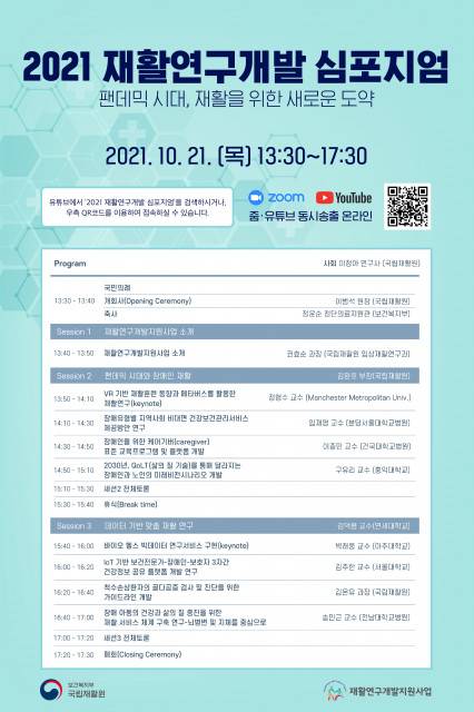 심포지엄에서는 국립재활원 이범석 원장의 인사 말씀, 보건복지부 정윤순 첨단의료지원관의 축사, 국립재활원 임상재활 연구과 권효순 과장의 재활연구개발지원사업 소개에 이어, 두 차례의 분과(세션)에서 기조연설과 우수 연구성과 발표, 토론이 연달아 진행될 예정이다.