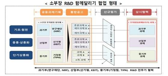 각 부처의 R&D 전담기관인 연구재단(NRF)-한국산업기술평가관리원(KEIT)-중소기업기술정보진흥원(TIPA)이 협의체를 구성하고 부처별로 소부장 R&D 수요에 대한 철저한 검증을 거쳐 공동 과제를 기획하고 평가 및 지원도 같이 한다.