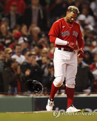 epa09533371 Boston Red Sox batter Xander Bogaerts reacts after striking out against the Houston Astros in the bottom of the seventh inning of game four of the MLB American League Championship Series between the Boston Red Sox and the Houston Astros at Fenway Park in Boston, Massachusetts, USA, 19 October 2021. EPA/CJ GUNTHER