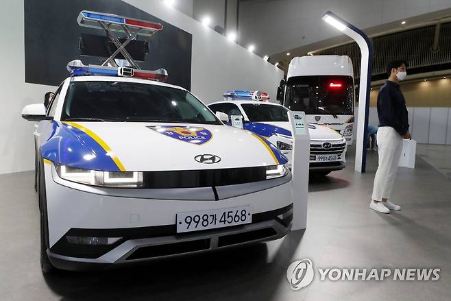 (인천=연합뉴스) 윤태현 기자 = 20일 오전 인천시 연수구 송도컨벤시아에서 열린 2021 국제치안산업박람회에서 전기·수소 경찰 순찰차량이 공개되고 있다. 2021.10.20