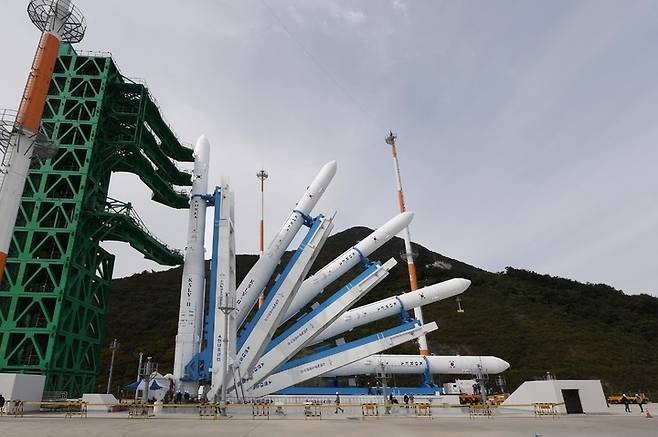[서울=뉴시스] 한국형 우주발사체 '누리호'가 20일 오전 전남 고흥군 나로우주센터 제2발사대에 기립되고 있다. (사진=한국항공우주연구원 제공) 2021.10.20. photo@newsis.com *재판매 및 DB 금지