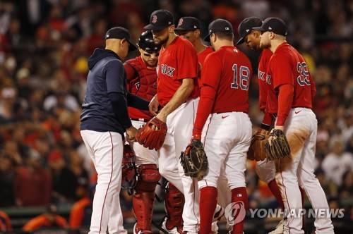 epa09533429 Boston Red Sox pitcher Nathan Eovaldi (C) is removed from the game against the Houston Astros in the top of the ninth inning of game four of the MLB American League Championship Series between the Boston Red Sox and the Houston Astros at Fenway Park in Boston, Massachusetts, USA, 19 October 2021. EPA/CJ GUNTHER