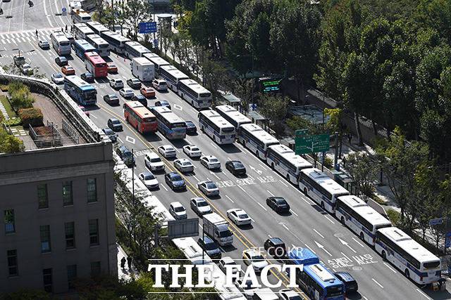[더팩트ㅣ남용희 기자] 전국민주노동조합총연맹(민주노총)이 서울을 비롯한 전국 14개 지역에서 대규모 총파업과 집회 개최를 예고한 20일 오후 서울 시청과 광화문 일대에 경찰 버스 차벽이 설치돼 있다.
