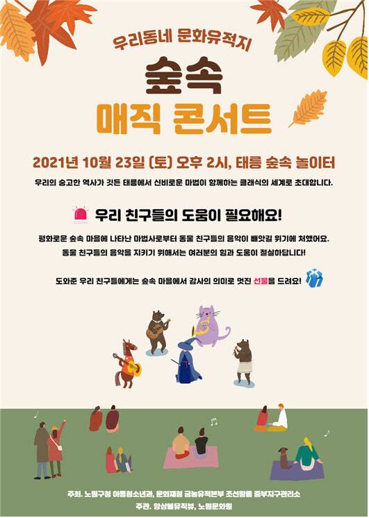 궁능유적본부 조선왕릉중부지구관리소는 오는 23일 오후 2시 조선왕릉중부지구관리소 태릉(중종비 문정왕후)에서 노원문화원과 함께 노원구 지역 내 다문화가정과 장애아동 등 문화소외계층을 대상으로 한 '숲속 매직 콘서트'를 진행한다고 20일 밝혔다.