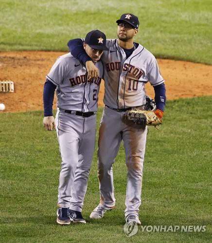 epa09533464 Houston Astros Yuli Gurriel (R) and Alex Bregman (L) celebrate after defeating the Boston Red Sox in game four of the MLB American League Championship Series between the Boston Red Sox and the Houston Astros at Fenway Park in Boston, Massachusetts, USA, 19 October 2021. EPA/RHONA WISE