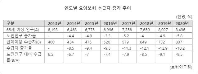 지난해 요양보험 수급자 수는 80만 7000명(노인인구 대비 9.5%)으로 지속적으로 증가중이다. 수급자 증가율은 2014년 8.5%에서 2020년 10.2%로 급속히 증가했다. 같은 기간 노인인구 증가율 4.4%에서 5.8%였다.