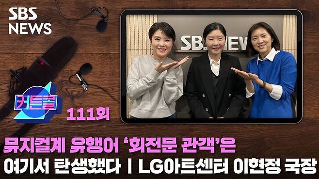 [ https://news.sbs.co.kr/d/?id=N1006503338 ] [골룸] 커튼콜 111 : 뮤지컬계 유행어 '회전문 관객'은 여기서 탄생했다 ㅣ마곡으로 이사 가는 LG 아트센터 이현정 국장 커튼콜 111회에서는 힙한 공연장 LG 아트센터의 '산 증인', 이현정 국장과 함께 합니다.