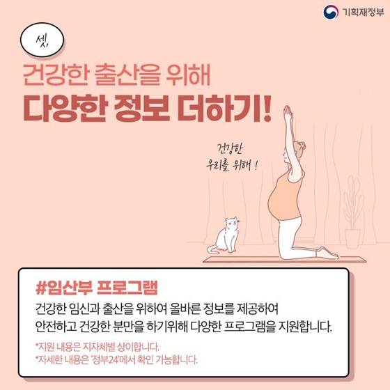 3. 건강한 출산을 위해 다양한 정보 더하기!"건강한 우리를 위해!" #임산부 프로그램 건강한 임신과 출산을 위하여 올바른 정보를 제공하여안전하고 건강한 분만을 하기 위해 다양한 프로그램을 지원합니다.