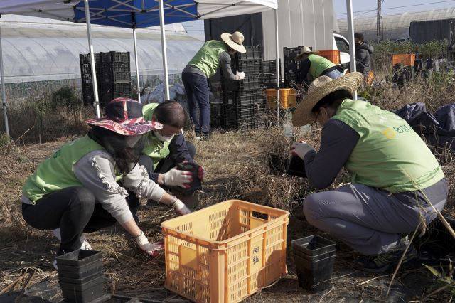 농협유통 임직원들이 20일 용인 남사농협 우리 화훼 농가를 찾아 구근작업을 하고 있다.