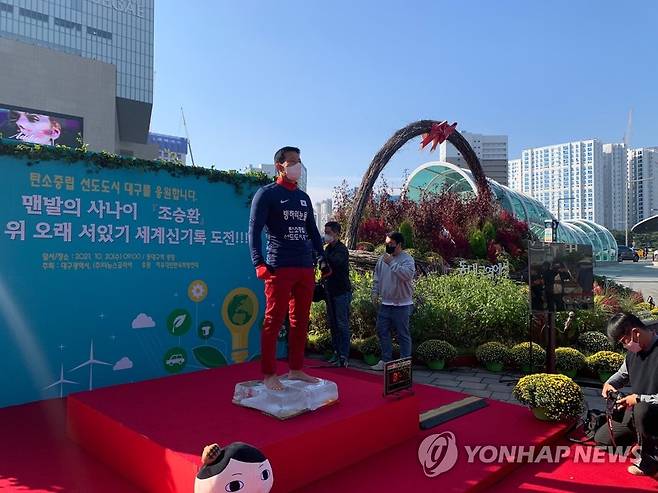 (대구=연합뉴스) '맨발의 사나이'라는 별명을 가진 조승환(55) 씨가 20일 대구에서 얼음 위 맨발로 오래 서 있기 신기록을 달성했다. 새 기록은 기존보다 3분이 더 긴 3시간 15분이다.2021.10.20