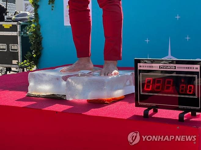 (대구=연합뉴스) '맨발의 사나이'라는 별명을 가진 조승환(55) 씨가 20일 대구에서 얼음 위 맨발로 오래 서 있기 신기록을 달성했다. 기후위기 심각성을 홍보하기 위한 것으로 새 기록은 기존보다 3분이 더 긴 3시간 15분이다.2021.10.20