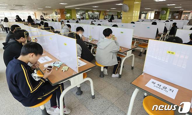 (수원=뉴스1) 김영운 기자 = 전국 학교비정규직노조가 총파업에 들어가면서 일부 학교에서 급식이 중단된 20일 오후 경기도의 한 학교에서 학생들이 빵과 과일, 음료로 구성된 대체 급식을 먹고 있다. 2021.10.20/뉴스1
