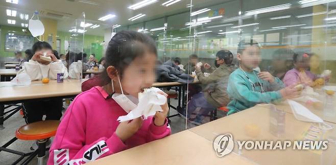 (서울=연합뉴스) 한종찬 기자 = 학교에서 급식, 돌봄 등의 업무를 하는 교육공무직 노동자들이 총파업에 나선 20일 서울 시내 한 초등학교에서 학생들이 대체 메뉴로 준비된 샌드위치와 쥬스를 먹고 있다. 2021.10.20 [공동취재]