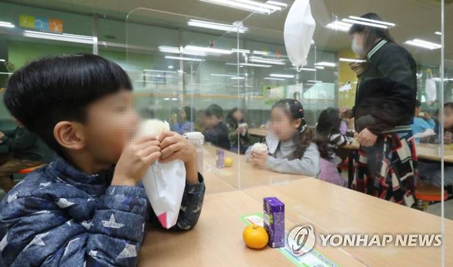 (서울=연합뉴스) 한종찬 기자 = 학교에서 급식, 돌봄 등의 업무를 하는 교육공무직 노동자들이 총파업에 나선 20일 서울 시내 한 초등학교에서 학생들이 대체 메뉴로 준비된 샌드위치와 쥬스를 먹고 있다. 2021.10.20 [공동취재]