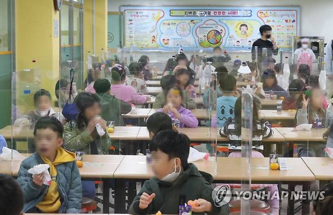 (서울=연합뉴스) 한종찬 기자 = 학교에서 급식, 돌봄 등의 업무를 하는 교육공무직 노동자들이 총파업에 나선 20일 서울 시내 한 초등학교에서 학생들이 대체 메뉴로 준비된 샌드위치와 쥬스를 먹고 있다. 2021.10.20 [공동취재]