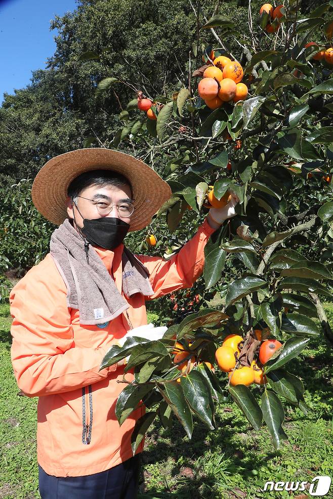 (서울=뉴스1) = 손병두 한국거래소 이사장이 20일 경남 밀양시 청도면 조천마을에서 농촌사랑 1사1촌 자매결연을 체결한 후 조천마을의 특산물인 단감 수확 봉사활동을 하고 있다. (한국거래소 제공) 2021.10.20/뉴스1
