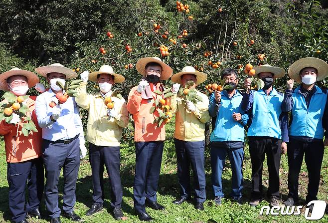 (서울=뉴스1) = 손병두 한국거래소 이사장(왼쪽 네번째)이 20일 경남 밀양시 청도면 조천마을에서 농촌사랑 1사1촌 자매결연을 체결한 후 조천마을의 특산물인 단감 수확을 마치고 기념촬영을 하고 있다. (한국거래소 제공) 2021.10.20/뉴스1