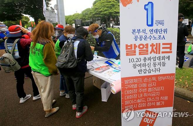 (제주=연합뉴스) 전지혜 기자 = 20일 오후 제주도청 앞에서 열린 민주노총 제주본부 주최 10·20 총파업대회에서 참석자들이 집회 전 발열 체크와 명부 작성 등을 하고 있다. 2021.10.20