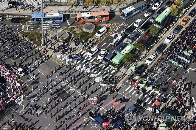(서울=연합뉴스) 윤동진 기자 = 10·20 민주노총 총파업에 참가한 조합원들이 20일 서울 서대문역 네거리에 기습 집결해 도로를 점거한 채 '5인 미만 사업장 차별 철폐·비정규직 철폐, 모든 노동자의 노조활동 권리 쟁취' 등을 주장하며 집회를 하고 있다. 2021.10.20