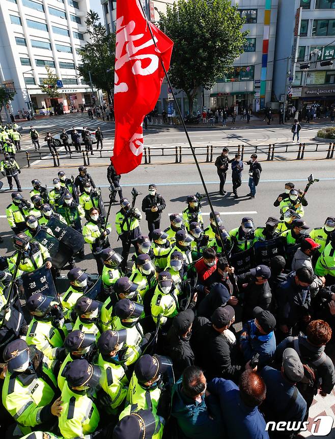 (서울=뉴스1) 안은나 기자 = 10·20 민주노총 총파업 집회가 열린 20일 오후 서울 중구 민주노총 앞 정동사거리에서 조합원들이 경찰과 대치하고 있다. 2021.10.20/뉴스1