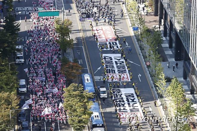 (서울=연합뉴스) 윤동진 기자 = 10·20 민주노총 총파업에 참가한 조합원들이 20일 서울 서대문역 네거리에 기습 집결해 도로를 점거한 채 '5인 미만 사업장 차별 철폐·비정규직 철폐, 모든 노동자의 노조활동 권리 쟁취' 등을 주장하며 집회를 하고 있다. 2021.10.20