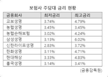 신한라이프생명은 최저 2.83%에서 최고 3.72%인 가운데, 농협손해보험 3.02%~4.24%, 한화생명 3.11%~4.71%, 삼성생명 3.13%~6.02%, 흥국생명 3.14%~3.41%, 현대해상 3.33%~4.83%, 농협생명 3.45%~3.45%, 교보생명 3.74%~4.79% 등이다. 하지만 보험사들도 신규 대출 여력이 많이 남아있지 않은 것으로 알려졌다.