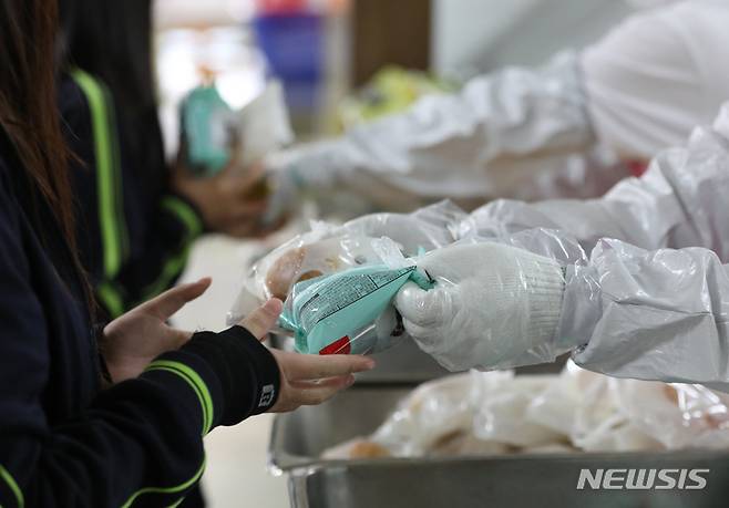 [수원=뉴시스] 김종택기자 = 학교 비정규직 노조원들의 파업으로 급식이 중단된 20일 경기도 한 학교에서 학생들이 대체식을 배식받고 있다. 교육부는 급식의 정상 운영이 어려운 경우 도시락, 빵, 우유 등 대체 급식을 제공하거나 단축 수업을 할 것을 일선 학교에 권고 하는등 대책 마련에 나섰다. 2021.10.20.