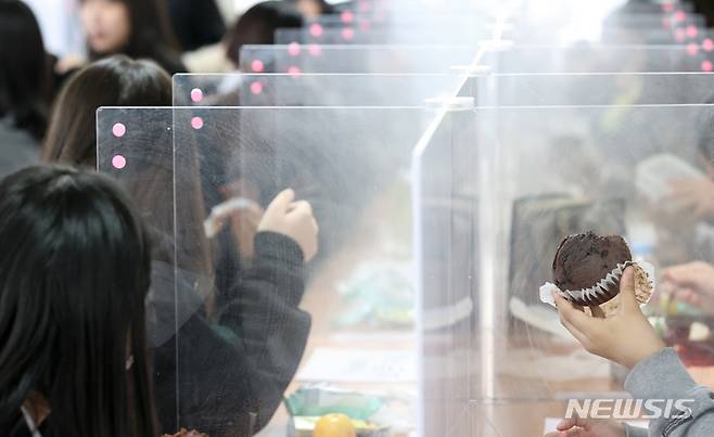 [수원=뉴시스] 김종택기자 = 학교 비정규직 노조원들의 파업으로 급식이 중단된 20일 경기도 한 학교에서 학생들이 대체식으로 점심을 해결하고 있다. 교육부는 급식의 정상 운영이 어려운 경우 도시락, 빵, 우유 등 대체 급식을 제공하거나 단축 수업을 할 것을 일선 학교에 권고 하는등 대책 마련에 나섰다. 2021.10.20.