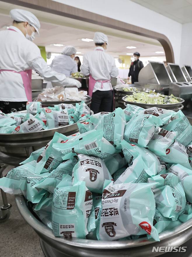 [수원=뉴시스] 김종택기자 = 학교 비정규직 노조원들의 파업으로 급식이 중단된 20일 경기도 한 학교 급식실에서 관계자들이 대체식을 준비하고 있다. 교육부는 급식의 정상 운영이 어려운 경우 도시락, 빵, 우유 등 대체 급식을 제공하거나 단축 수업을 할 것을 일선 학교에 권고 하는등 대책 마련에 나섰다. 2021.10.20.