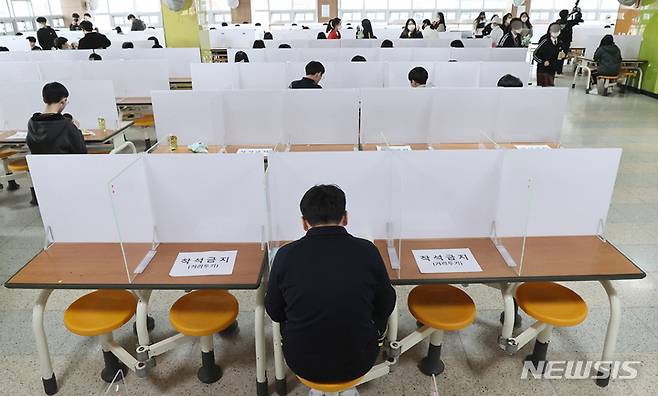 [수원=뉴시스] 김종택기자 = 학교 비정규직 노조원들의 파업으로 급식이 중단된 20일 경기도 한 학교에서 학생들이 대체식으로 점심을 해결하고 있다. 교육부는 급식의 정상 운영이 어려운 경우 도시락, 빵, 우유 등 대체 급식을 제공하거나 단축 수업을 할 것을 일선 학교에 권고 하는등 대책 마련에 나섰다. 2021.10.20.