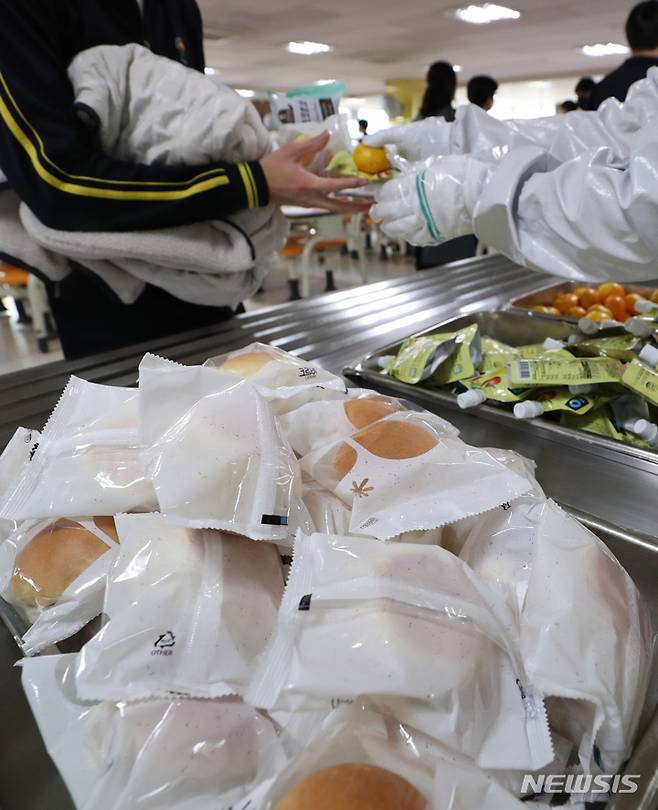 [수원=뉴시스] 김종택기자 = 학교 비정규직 노조원들의 파업으로 급식이 중단된 20일 경기도 한 학교에서 학생들이 대체식을 배식받고 있다. 교육부는 급식의 정상 운영이 어려운 경우 도시락, 빵, 우유 등 대체 급식을 제공하거나 단축 수업을 할 것을 일선 학교에 권고 하는등 대책 마련에 나섰다. 2021.10.20.