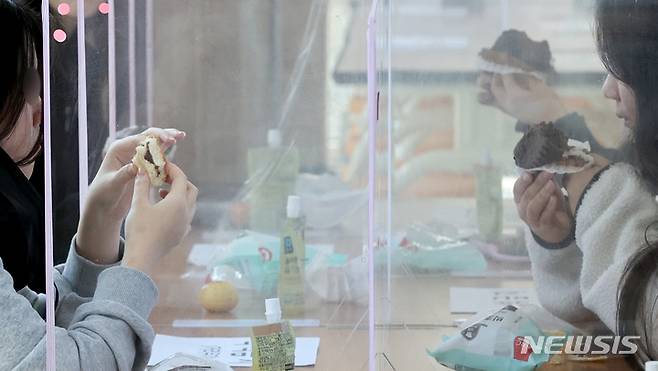 [수원=뉴시스] 김종택기자 = 학교 비정규직 노조원들의 파업으로 급식이 중단된 20일 경기도 한 학교에서 학생들이 대체식으로 점심을 해결하고 있다. 교육부는 급식의 정상 운영이 어려운 경우 도시락, 빵, 우유 등 대체 급식을 제공하거나 단축 수업을 할 것을 일선 학교에 권고 하는등 대책 마련에 나섰다. 2021.10.20.