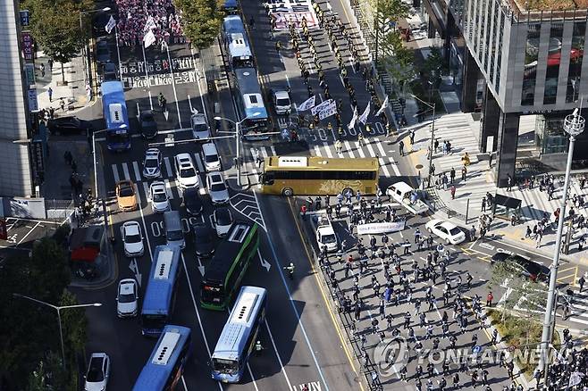(서울=연합뉴스) 윤동진 기자 = 10·20 민주노총 총파업에 참가한 조합원들이 20일 서울 서대문역 네거리에 기습 집결해 집회를 하자, 교통 혼잡이 빚어지고 있다. 2021.10.20
