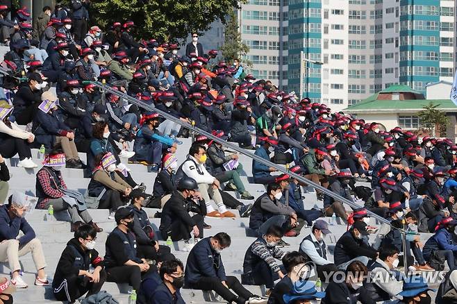 (청주=연합뉴스) 천경환 기자 = '1020 총파업 사수 결의대회'가 열린 20일 오후 충북 청주실내체육관 앞에 민주노총 조합원들이 모여 있다. 2021.10.20