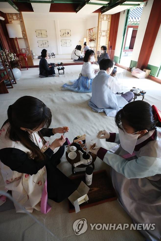 (서울=연합뉴스) 강민지 기자 = 20일 오후 서울 경복궁 생과방에서 사전예약자들이 궁중 병과와 차를 즐기고 있다.