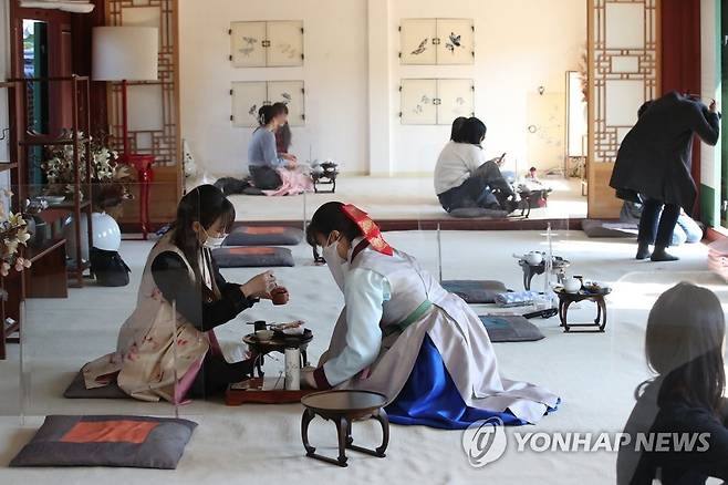 (서울=연합뉴스) 강민지 기자 = 20일 오후 서울 경복궁 생과방에서 사전예약자들이 궁중 병과와 차를 즐기고 있다.