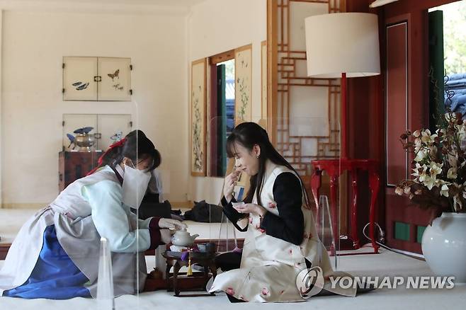 (서울=연합뉴스) 강민지 기자 = 20일 오후 서울 경복궁 생과방에서 사전예약자들이 궁중 병과와 차를 즐기고 있다.