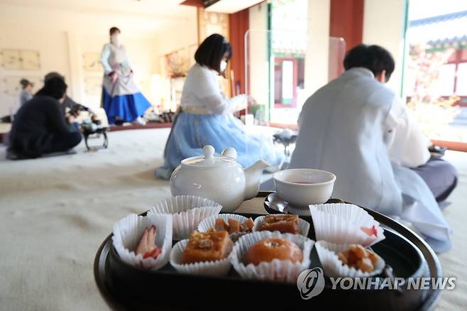 (서울=연합뉴스) 강민지 기자 = 20일 오후 서울 경복궁 생과방에서 사전예약자들이 궁중 병과와 차를 즐기고 있다.