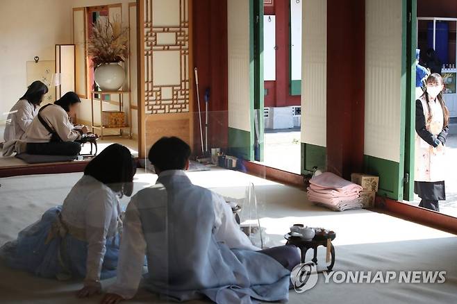 (서울=연합뉴스) 강민지 기자 = 20일 오후 서울 경복궁 생과방에서 사전 예약자들이 궁중 병과와 차를 즐기고 있다.