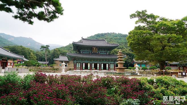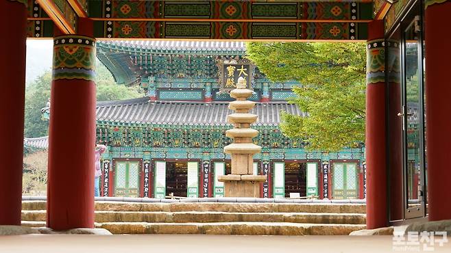 천상의 세계 불국토가 있는 수미산의 입구 일주문을 지나 동서남북 사악한 것들과 부정한 것들이 침범하지 못하게 막고 있는 해탈문(사천왕문), 널리 백성을 구제하는 것[廣濟蒼生]을 서원하는 광제루, 부처님의 사리를 모신 5층 석탑, 그리고 부처님을 모신 2층으로 지어진 당당한 모습의 대웅전에 이르게 됩니다.