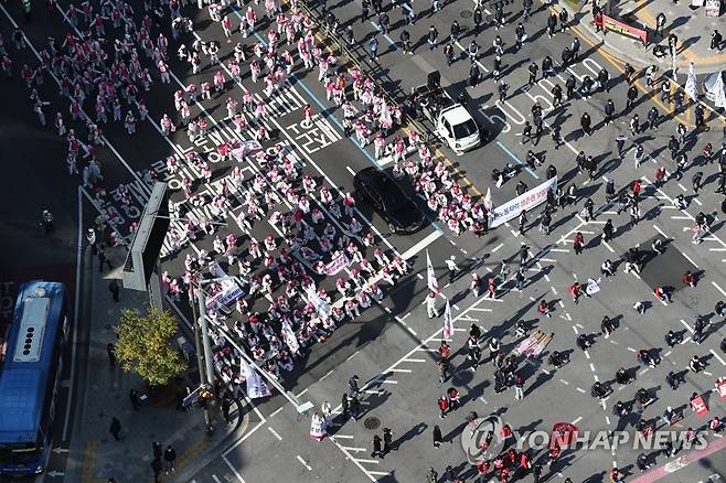(서울=연합뉴스) 윤동진 기자 = 10·20 민주노총 총파업에 참가한 조합원들이 20일 서울 서대문역 네거리에 기습 집결해 도로를 점거한 채 '5인 미만 사업장 차별 철폐·비정규직 철폐, 모든 노동자의 노조활동 권리 쟁취' 등을 주장하며 집회를 하고 있다. 2021.10.20 [공동취재]