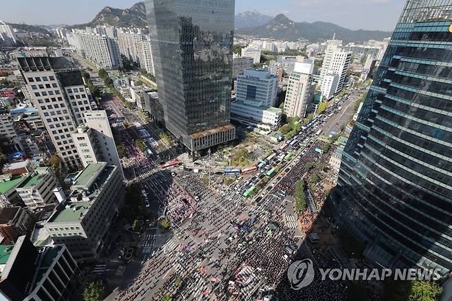 (서울=연합뉴스) 윤동진 기자 = 10·20 민주노총 총파업에 참가한 조합원들이 20일 서울 서대문역 인근에 기습 집결해 도로를 점거한 채 집회를 하고 있다. 2021.10.20 [공동취재]